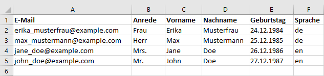 Abonnenten: ImportWahrscheinlich haben Sie bereits eine Liste von Adressen zusammengestellt, die Sie per Newsletter anschreiben möchten. Über das universelle CSV-Dateiformat lassen sich Ihre Adressen aus nahezu jeder Datenbank oder Tabellenkalkulation (z. B. Microsoft Office oder Open Office) exportieren und anschließend in bm_mail importieren. Um die Zuordnung der Spalten (z. B. Vorname, Nachname, E-Mail) beim Import zu erleichtern, sollte die erste Zeile Ihrer CSV-Datei aussagekräftige Spaltenüberschriftten enthalten. Ein Beispiel: