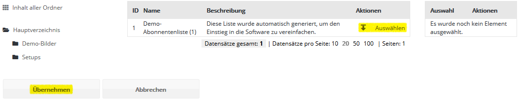 Schritt 3 - AbonnentenlistenWählen Sie nun aus, in welche bm_mail Abonnentenliste ihre CSV-Datei importiert werden soll. Falls Sie zuvor keine eigene Abonnentenliste in bm_mail angelegt haben (siehe Menü Abonnentenlisten), steht zum schnellen Einstieg die leere Abonnentenliste 'Demo-Liste' bereit. Diese Liste wird in der Regel bei der Einrichtung Ihres bm_mail Kontos angelegt und zur Demonstration mit einem Beispiel-Abonnenten befüllt.