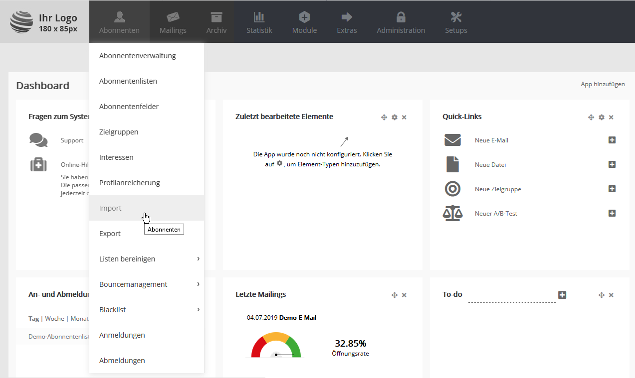 Zum Abspeichern Ihrer Daten wählen Sie bitte je nach Version Ihres Office-Paketes das Exportformat CSV UTF8 (Trennzeichen-getrennt) oder CSV (Trennzeichen-getrennt). Import Schritt für Schritt erklärtUm Ihre CSV-Datei in bm_mail zu importieren, wählen Sie im Menü 'Abonnenten' den Punkt 'Import':