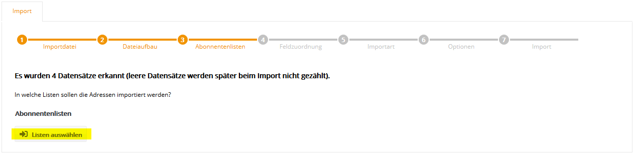 Auch die Auswahl mehrerer Abonnentenlisten ist möglich, falls Sie parallel in mehrere Listen importieren möchten. Klicken Sie nach Auswahl der gewünschten Liste(n) auf 'Übernehmen' und anschließend auf 'Weiter'. Der Name einer Abonnentenliste lässt sich im Menü Abonnentenlisten auch nachträglich jederzeit ändern. Schritt 4 - FeldzuordnungIn Schritt 4 teilen Sie bm_mail mit, welche Spalte (z.B. Vorname, Nachname) Ihrer CSV-Datei in welches bm_mail Abonnentenfeld importiert werden soll. Zum schnellen Einstieg sind typische Abonnentenfelder wie 'E-Mail', 'Anrede', 'Vorname' und 'Nachname' in bm_mail bereits vorhanden.