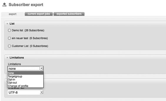 Subscribers lists can be exported from bm_mail as CSV – files. An advantage, for example, is that you can back up the address lists in this way. In the tab 'Export’, you can make choices of the lists that have to be exported. Per export only one subscriber list can be chosen. If you only want to export certain data records, you can decide on 'Limitations’. |
