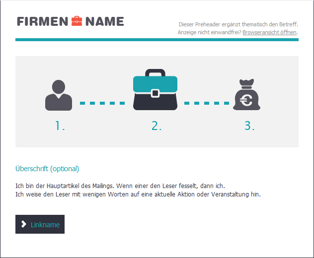 Geben Sie 'Betreff' und 'Absendername' Ihres Mailings ein. Beides wird im Posteingang des Abonnenten darüber entscheiden, ob er die Mail öffnet oder nicht.
