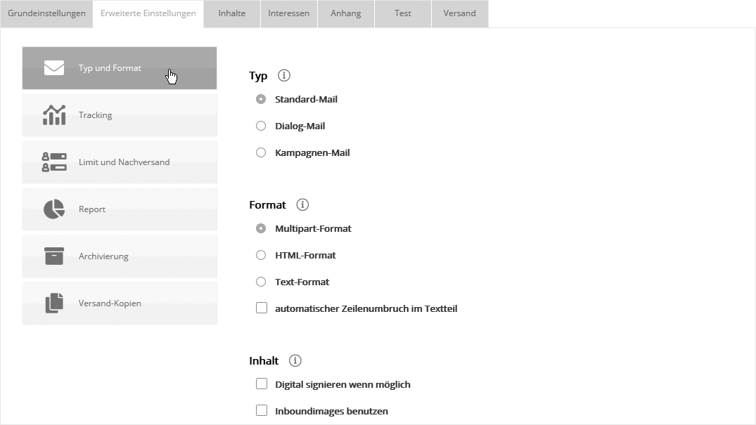 Wählen Sie im Bereich 'Typ' , ob Ihr Mailing ein Standard-, Dialog- oder Kampagnen-Mailing ist. Die Unterschiede: