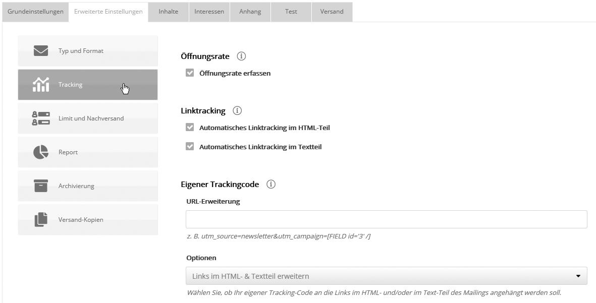 ÖffnungsrateUm nach dem Versand auszuwerten, wieviel Prozent der Empfänger das Mailing geöffnet haben (siehe 'Übersicht, Öffnungs-/Klickrate'), muss die Option 'Öffnungsrate erfassen' aktiviert sein. Dazu integriert bm_mail im HTML-Teil des Mailings ein unsichtbares Zählpixel, welches für jeden Empfänger individuell verlinkt ist und dessen Aufruf als Öffnung gezählt wird. Die Messung funktioniert unabhängig von der Mailing-Einstellung 'Inboundimages', solange der Empfänger die Anzeige von Bildern in seinem Posteingang nicht unterdrückt. Hinweis: Ist die Erfassung der Öffnungsrate deaktiviert, aber die nachfolgende Option "Linktracking" aktiviert, dann werden Klicks automatisch auch als Öffnung gewertet. Die Öffnungsrate erfasst in dem Fall nur den Teil der Öffner, der irgendeinen Link angeklickt hat. LinktrackingAktivieren Sie Automatisches Linktracking im HTML-Teil, so wird jeder im Mailing enthaltene Link durch einen Tracking-Link ersetzt, der für jeden Abonnenten individualisiert ist. Diese Tracking-Links werden über den bm_mail-Server auf die ursprüngliche Link-URL umgeleitet und dabei gezählt. Damit können Sie nach Versand des Mailings sehen, wie oft jeder Link angeklickt wurde (siehe 'Übersicht, Öffnungs-/Klickrate'). Weiterhin lassen sich darauf basierend Zielgruppen bilden, z. B. "Alle, die Link B angeklickt haben" können erneut mit weiteren Informationen angeschrieben werden. Bitte beachten Sie, dass Sie jede URL vorher als Link definieren müssen. Sie können die Richtigkeit der Tracking-Links überprüfen, indem Sie sich ein Testmailing zusenden. Eigener Tracking-CodeHier ist es möglich, alle Links des Mailings automatisch um eigene Parameter zu erweitern. Damit lässt sich das weitere Verhalten der Newsletterempfänger per Website-Analyse-Tools wie z.B. Google Analytics, Piwik oder econda tracken. Kopieren Sie dazu den Tracking Code Ihres Tools in das Feld, damit bm_mail ihn automatisch an alle externen Links Ihres Mailings anhängt. Folgende Parameter werden unterstützt: