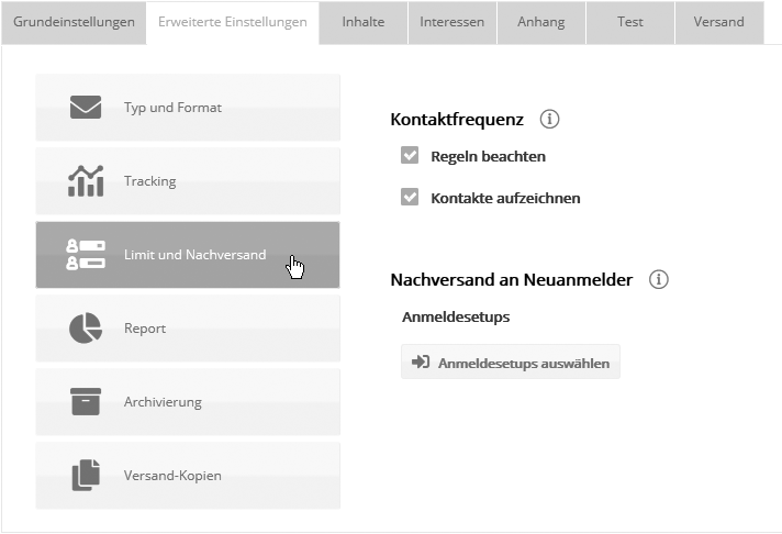 KontaktfrequenzDie Wirkung der beiden Kontaktfrequenz-Optionen ist im Abschnitt 'Individuelle Einstellung pro Mailing' als Teil des Themas 'Kontaktfrequenz' detailiert beschrieben. Die Optionen sind an dieser Stelle nur dann wirksam, wenn im zentralen Menü 'Administration' --> 'Kontaktfrequenz' die Kontaktfrequenz-Prüfung aktiviert ist. Nachversand an NeuanmelderAuf Wunsch versenden Sie das aktuelle Mailing automatisch an jeden neuen Abonnenten, der sich über das hier gewählte Anmeldesetup anmeldet. Sobald Sie das Mailing versenden, wird es am Anmeldesetup zum Nachversand eingetragen. Diese Zuordnung bleibt erhalten, bis sie erneut ein Mailing mit aktivierter Nachversand-Option versenden, oder am Anmeldesetup ein anderes Mailing wählen. Eine ausführliche Beschreibung der Nachversand-Optionen finden Sie im Artikel zum Anmeldesetup. Erweiterte Einstellungen: Report