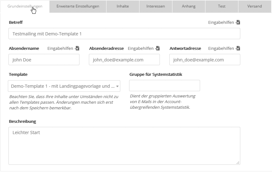 Nachdem Sie ein neues Mailing erstellt haben, legen Sie die Grundeinstellungen fest. Grundeinstellungen