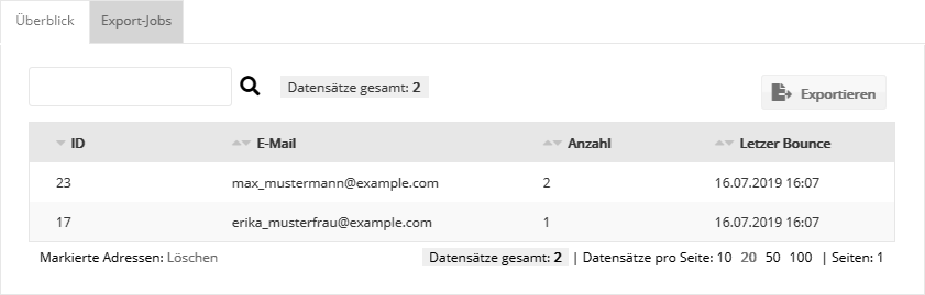 Reiter 'Überblick'Hier werden alle E-Mail-Adressen aufgelistet, deren Versendungen aufgrund von drei aufeinanderfolgenden Hardbounces zurückgehalten werden. Diese Adressen werden auf der bm_mail-internen 'Retained List' gesammelt. Verwaltet werden hier ausschließlich die reinen E-Mail-Adressen, unabhängig von den dazugehörenden (eventuell ehemaligen) Abonnenten. Oben rechts können Sie mit Klick auf den 'Exportieren'-Button die zurückgehaltenen E-Mail-Adressen als CSV-Datei exportieren. Die erzeugte CSV-Datei lässt sich anschließend auf dem Reiter 'Export-Jobs' herunterladen.