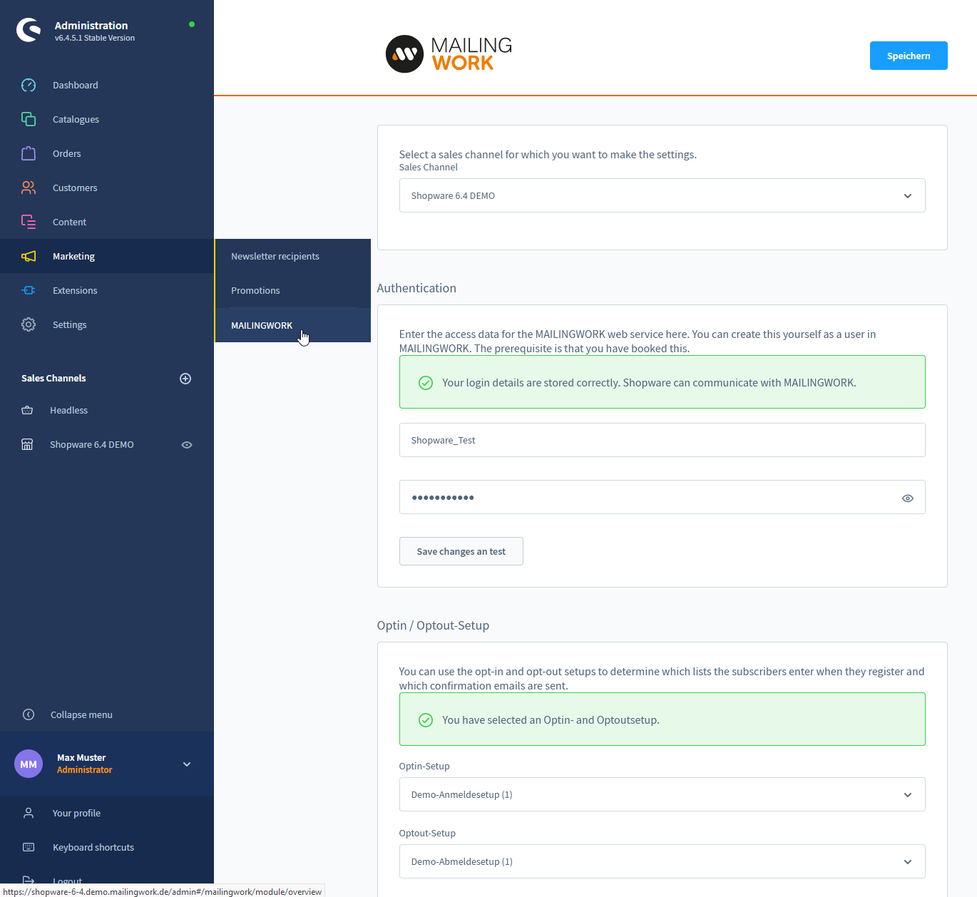 Log in to the admin area of your Shopware store. Under the "Marketing ⭢ MAILINGWORK" tab, you will find all the relevant settings. You make the settings for each sales channel.