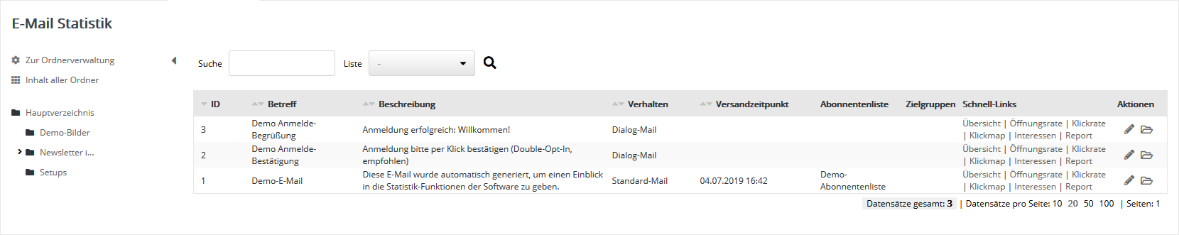 Über die Schnell-Links 'Übersicht', 'Öffnungsrate', 'Klickrate', 'Klickmap',  'Interessen' und 'Report' gelagen Sie sofort zum gewünschten Detail-Reiter der Statistik. Über die Aktionen 'Öffnen' und 'Ordner öffnen' lässt sich entweder die Statistik oder der Ordner öffnen, in dem sich die E-Mail befindet.