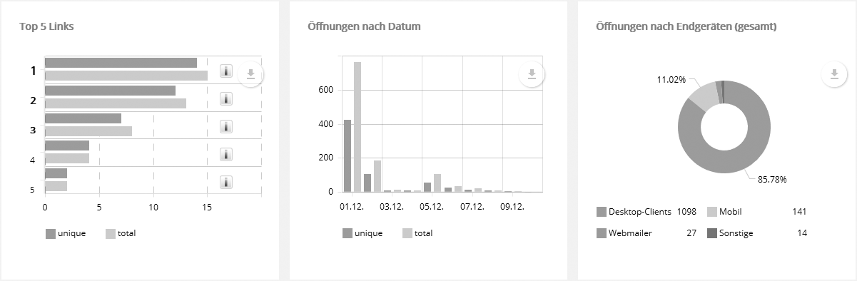 Per Klick auf 'Vollbild' wird die Karte im gesamten Fenster dargestellt. Direkt unter dem Vollbild-Link können Sie per Download-Button die Grafik der Karte in verschiedenen Formaten herunterladen. Hinweis: Obwohl IP-Adressen grundsätzlich nicht an einen bestimmten Ort gebunden sind, lässt sich durch die bekannten IP Adressräume von Internetprovidern, Universitäten und ähnlichen Einrichtungen in vielen Fällen der Standort ermitteln. Da regionale Einwahlknoten häufig einen festen IP-Adresspool besitzen, funktioniert das Verfahren auch bei dynamischer IP-Vergabe. Für die Zuordnung nutzt bm_mail eine regelmäßig aktualisierte lokale Kopie einer Geotargeting-Datenbank, die ein externer Dienstleister zur Verfügung stellt. --> Top 5 Links + Öffnungen nach Datum und EndgerätenWie bei jedem anderen Diagramm lassen sich auch hier per Download-Button (rechte obere Ecke) die angezeigten Daten als Grafik- oder Excel-Datei herunterladen. Einzelne Diagramm-Segmente lassen sich ein- oder ausblenden, indem man auf den entsprechenden Punkt in der Legende klickt, z.B. auf 'Desktop-Clients' im Diagramm 'Öffnungen nach Endgeräten'. Damit werden die übrigen Segmente auf 360° gezoomt und deren Prozentzahlen passen sich der neuen Anordnung an. So lässt sich das Verhältnis beliebiger Segmente direkt vergleichen.