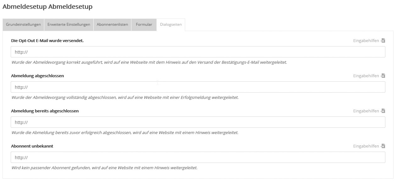 AbonnentenlistenJe nachdem, ob die Abmeldung per Newsletter-Link oder per Website-Formular stattfindet, wird der Abonnent aus folgenden Listen abgemeldet: Variante 1: Abmeldelink im NewsletterFür Standardmails gilt: Zusätzlich zu den auf dem Reiter 'Abonnentenlisten' gewählten Listen findet die Abmeldung auch in den angeschriebenen Listen statt. Für Kampagnen- und Dialogmails gilt dieser Zusatz nicht, da diese nicht an eine bestimmte Liste verschickt werden. Variante 2: Abmeldeformular auf WebsiteDie Abmeldung findet in den unter 'Abonnentenlisten' markierten Listen statt, und wenn vorhanden, dann auch in den direkt im Formular zur Auswahl durch den Nutzer angebotenen Listen (siehe nächster Abschnitt 'Formular'). Beides gleichzeitig ist nicht möglich. Das heißt: Sobald Sie eine Liste im Reiter 'Abonnentenlisten' markiert haben (und damit fest vorgeben), kann sie nicht gleichzeitig im Abmelde-Formular (ab)wählbar sein. Im dem Fall wird sie automatisch aus dem Formular entfernt und umgekehrt. Sonderfall beim Abmeldeformular: Ist keine Liste zur Abmeldung markiert und auch im Formular keine enthalten, dann findet die Abmeldung in allen Listen statt. Damit wird der Abonnent auch aus der 'Abonnentenverwaltung' entfernt. FormularHier erstellt bm_mail automatisch den Quellcode für ein Abmeldeformular, das Sie auf Ihrer Website einbinden können. Den Inhalt des Formulars stellen Sie per Drag&Drop zusammen. Die Bedienung ist identisch zum Anmeldeformular-Editor. Nach Klick auf den Button 'Test des Formulars' wird Ihr neues Abmeldeformular angezeigt und die Funktion lässt sich anhand realer Abmeldungen testen. Geben Sie gültige und ungültige Abonnentendaten ein, um die entsprechenden Textmeldungen bzw. Dialogseiten zu prüfen. Ein während des Tests abgemeldeter Abonnent lässt sich unter 'Abonnenten' -> 'Abmeldungen' wiederherstellen. --> Hinweis zu Abmeldungen beim Testversand: Solange es sich um den Testversand eines Mailings handelt, findet bei Klick auf den Abmeldelink keine Abmeldung statt. Stattdessen wird lediglich eine Bestätigung angezeigt, ob das Abmeldesetup korrekt eingerichtet wurde. Erst beim späteren realen Versand findet eine tatsächliche Abmeldung statt und es erscheint die von Ihnen eingestellte Dialogseite, die Sie unter 'Formular testen' jederzeit testen können. Dialogseiten |